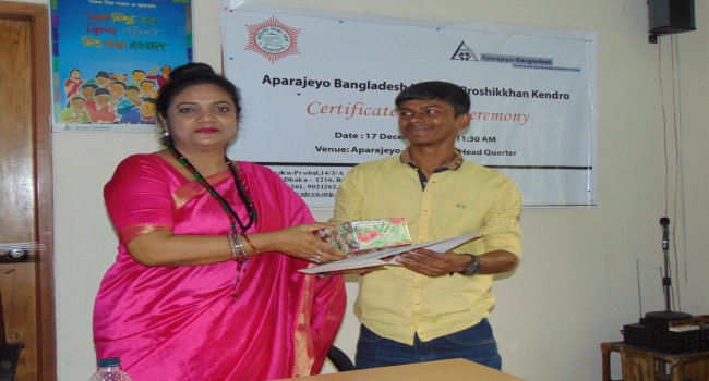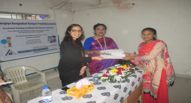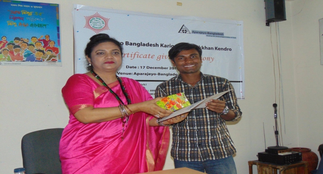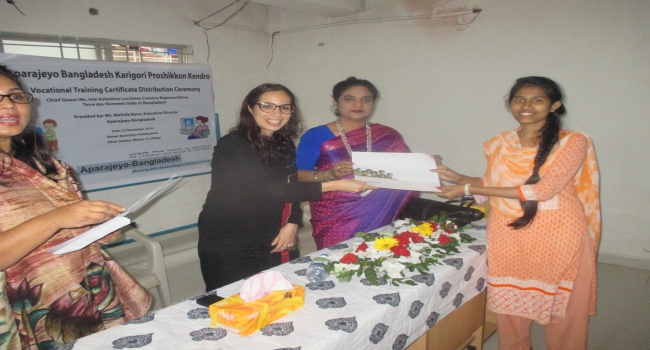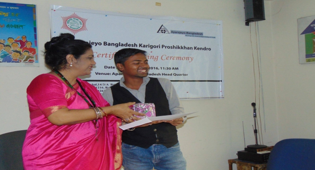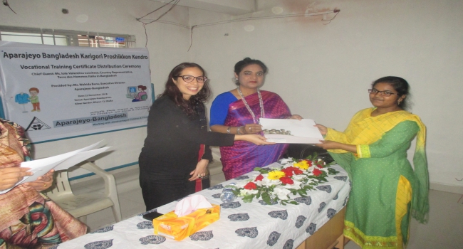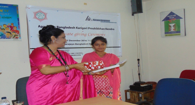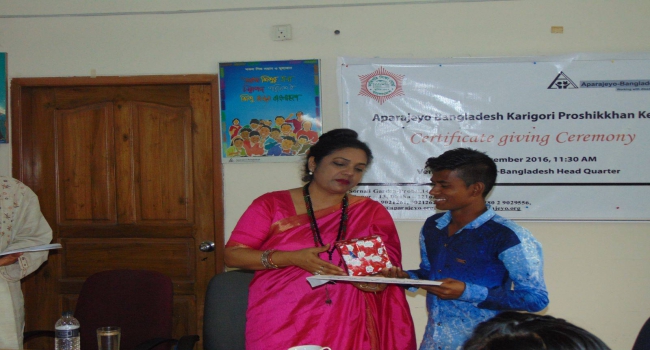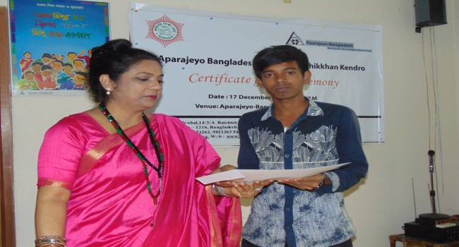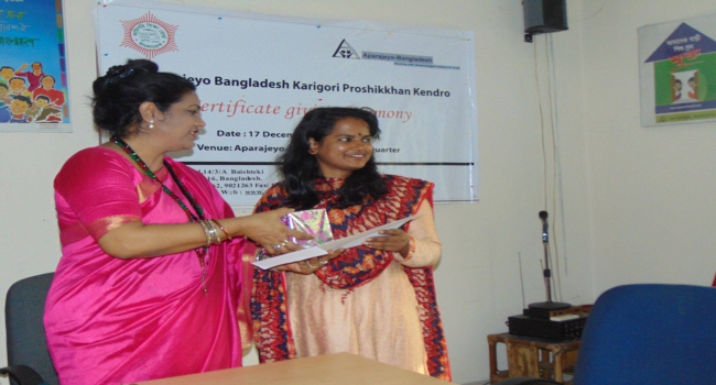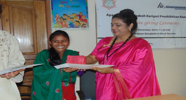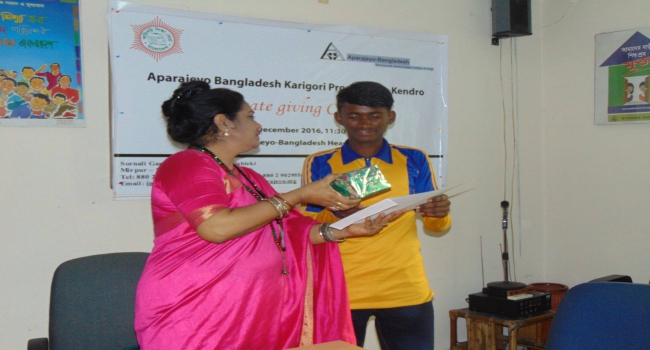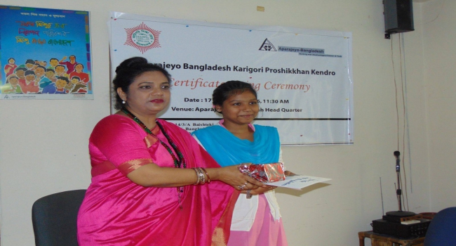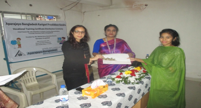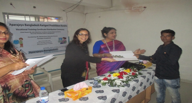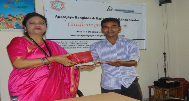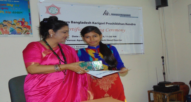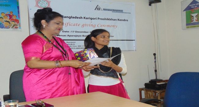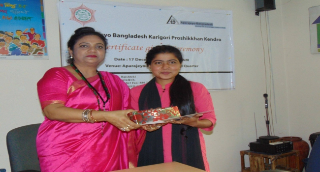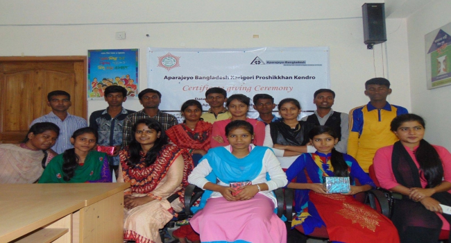 Find Out MoreAparajeyo-Bangladesh (AB) has been operational for the past 27 years in supporting the disadvantaged children, youth and women across Bangladesh. We believe that every child is born with fundamental rights. Each child is unique and has the right to a name and a nationality, the right to grow up in a safe and protective environment, an education, food, recreation & play, the right to health and proper health care. Each has the right to participate in matters that affect them, and the right to be treated equally. Every child has the right to be protected from all forms of abuse and exploitation. Aparajeyo- Bangladesh Karigori Proshikhon Kendra is a Government certified vocational training center under the Technical Education Board and began its operations in January 2016. There are two trade trainings offered at the center at Mirpur-13 - Dress Making & Tailoring training and Computer Office Application training. These courses last for three months and six months respectively. The trainings are conducted in two batches of students who arrive at their designated times to attend the classes offered by the experienced trainers. AB trainers have been out in the fields in order to make community members aware of the facilities available at the center.